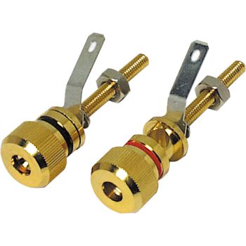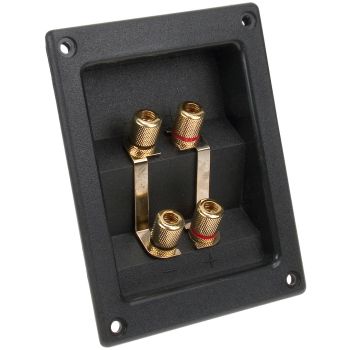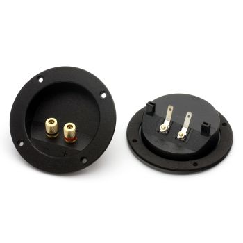 Enkel og rimelig høyttalerterminal som tar uisolerte høyttalerkabler direkte uten behov for ekstra plugger eller kontakter.